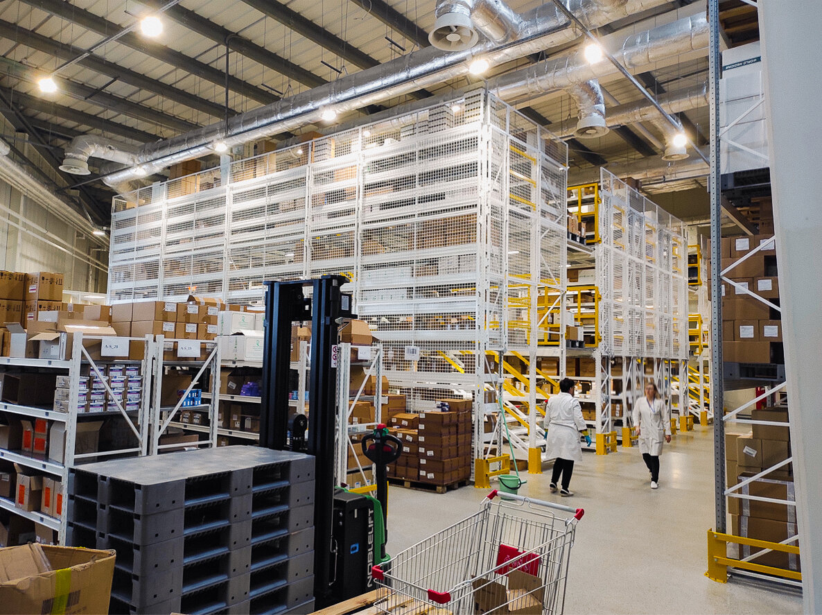 Общая площадь склада составляет 2500 кв. м., высота хранения до 6 м, ассортимент — порядка 3500 активных номенклатурных позиций.