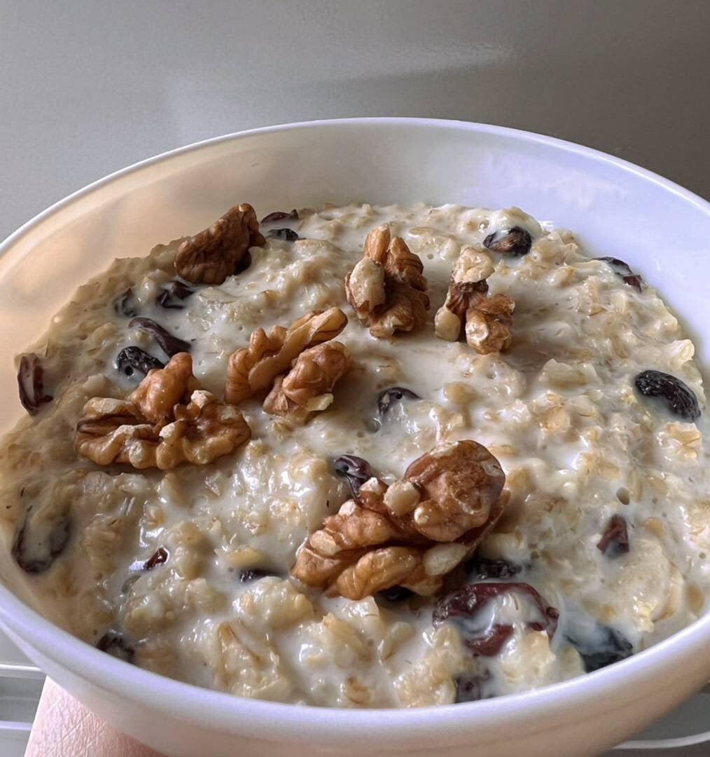 Обычно я ем овсянку с фруктами или ягодами, но все закончилось, а муж еще спит и некого послать за фруктами😁 Перебилась тем, что нашла - изюмом и орехами. #завтрак #овсянаякаша #овсянка #геркулес #детям #пп #безсахара #полезно #дляфигуры #вкусно #англия #россия #москва #весна #крупы #крупа #правильноепитание #фитнес #орехи #грецкийорех #витамины #изюм #виноград Ингредиенты: геркулеса (варка 15 мин), молока, изюма, ядер грецкого ореха, кипяток Способ приготовления: Изюм промойте под проточной водой и залейте крутым кипятком. Через 15 минут снова промойте и залейте новым кипятком, оставьте на 20 минут. Промойте контрольно и отложите в сторону. Как готовить овсянку. В готовую овсянку засыпьте изюм, перемешайте и выложите в блюдо, украсьте орехами. Приятного завтрака!