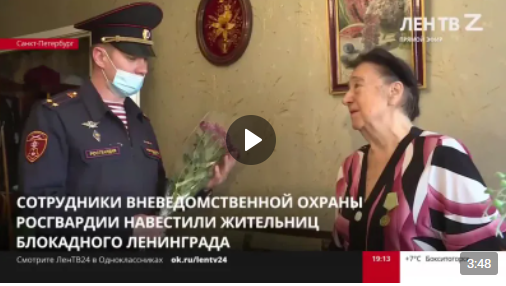 Сюжет программы "Новости" (телеканал "ЛенТВ 24") о том, что представители отдела вневедомственной охраны по Петроградскому району Санкт-Петербурга поздравили с Днём Победы в Великой Отечественной войне ветеранов службы и жительниц блокадного Ленинграда – Стеру Берковну Слив и Ядвигу Алексеевну Остроумову. Ссылка на телесюжет: https://vk.com/rosgvard78?w=wall-143037784_7904