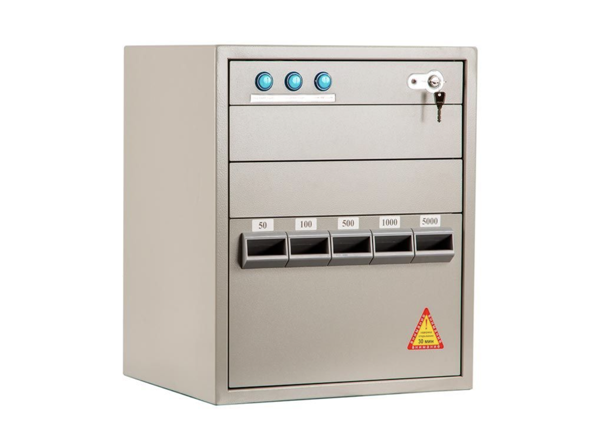 Кассирам предоставляется возможность депонировать финансы, открывать отсек с деньгами. Тогда как внутренний блок с крупной наличностью способен открыть только старший сотрудник. Сама установка прикрепляется к полу анкерными болтами, а также много весит, поэтому вынести ее прямо с деньгами не получится.