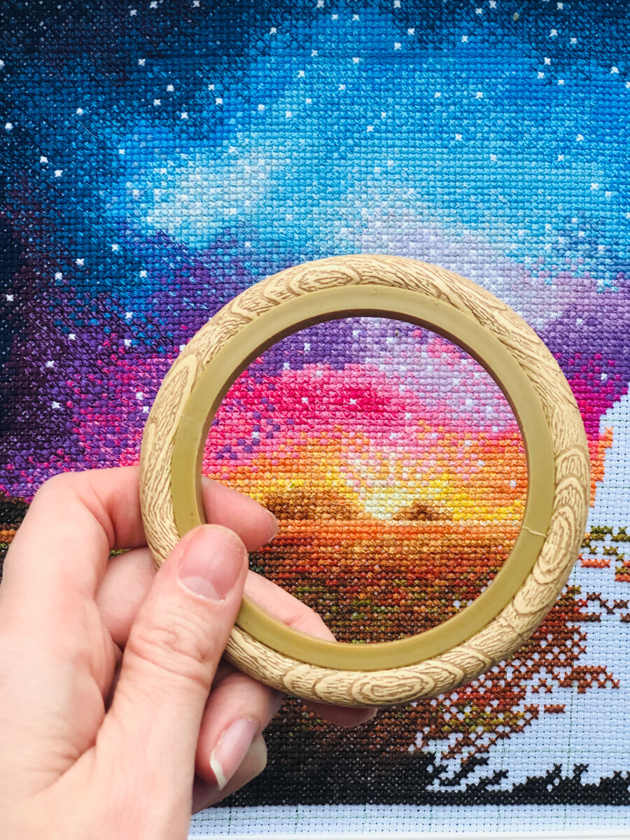 Я до сих пор не понимаю, как эти яркие цвета так плавно переходят друг в друга, как я это сделала нитками? А как это удалось сделать дизайнеру? Космос в моих руках, хочется делиться этим процессом, как небо делится звездами, как луна светом... Надо сказать, что начала я этот процесс 1 января 2020 года. Я ждала сложнейшей операции и мне нужно было видеть свет в конце тоннеля. Я решила его вышить. А вот одна из моих любимейших фото А это небо и ничего лишнего Вы можете заметить, что канва здесь разлинована в клеточку. Вышивальщицы часто делают это маркером, но здесь я использовала уже готовую канву с нанесенной разлиновкой, так как полная зашивка - это очень удобно. Также это мой первый опыт работы с пяльцами нюрге. Канва с разметкой очень удобна, сколько ошибок было замечено вовремя. А здесь я оставлю ссылки на видео, где уже видно готовую работу и есть возможность поразглядывать и посмеяться над Чикетти. И еще немного вариаций фото, на которые меня вдохновила эта работа. Спустит