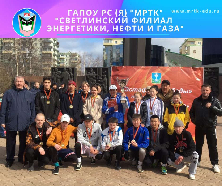 Студенты «Светлинского филиала энергетики, нефти и газа» и МРТК – победили в легкоатлетической эстафете Победы на призы газеты «Мирнинский рабочий». Видео. 9 мая 2022 г. после шествия «Бессмертного полка» на площади Победы в г. Мирном РС (Я) собрались спортсмены. После коронавирусных ограничений состоялась легкоатлетическая эстафета на призы газеты «Мирнинский рабочий». Мероприятие посвящено 77-летию годовщины победы в Великой Отечественной войне. В Мирном это стало доброй традицией. 2022 год стал 53-им в эстафете. Заместитель директора управления спорта, культуры и молодежной политики МО «Город Мирный» Александр Червяков, сказал напутственные слова, желая честной борьбы и воли к победе. По итогам эстафеты среди студентов лидером стала команда «Светлинского филиала МРТК. Второе место заняла команда «Регионального технического колледжа в г. Мирном», третье место досталось МПТИ (ф) СВФУ. Директор МРТК Владимир Березовой поздравил спортивные команды, отметив важный успех победы Светлинск