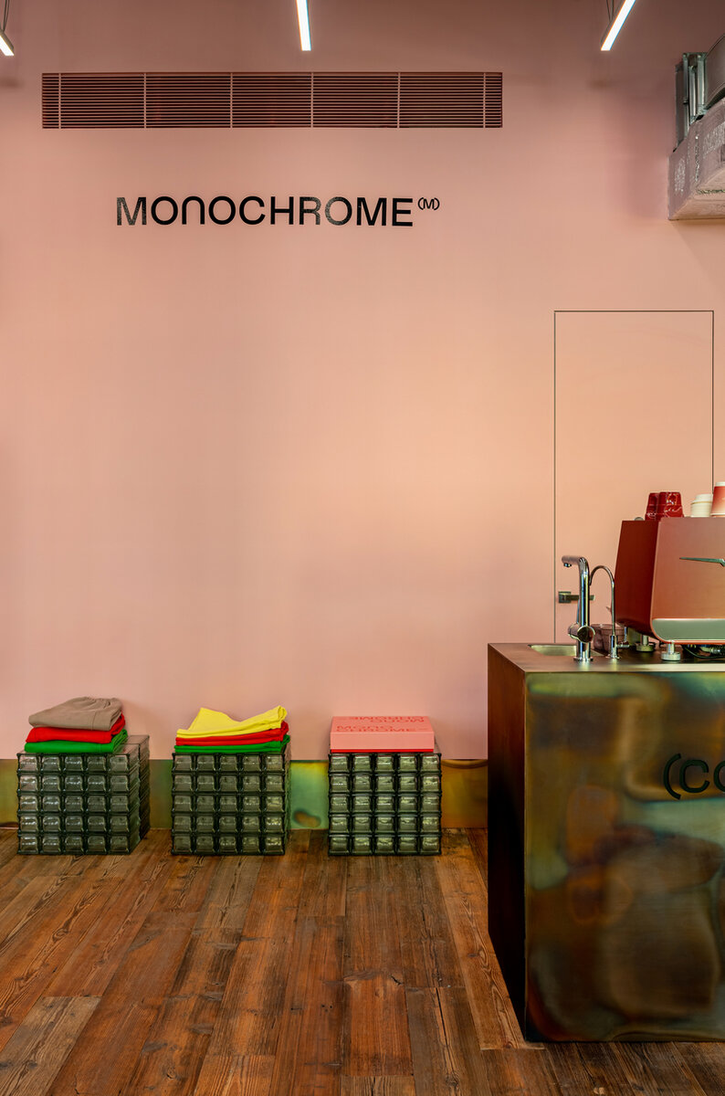 Мы открылись там в марте 2022 года, и это наше третье офлайн-пространство. В питерском магазине нам хотелось именно "питерского" настроения — под него и искали дизайнера. Мы сотрудничали с Анастасией Хальчицкой, которая входит в топ-100 дизайнеров России по версии AD. У нее была непростая задача — сохранить культурные особенности Петербурга и подчеркнуть расположение магазина в "золотом треугольнике" (Невский проспект, Дворцовая набережная Невы и река Фонтанка — Прим. ред.). А еще мы решили, что дизайн магазина будет построен на контрасте материалов. Так совместились старая амбарная доска и прозрачный цветной пластик, винтажная мебель и современные светильники. При этом сохранился фирменный розовый цвет бренда и уже ставшие узнаваемыми желтые окна.