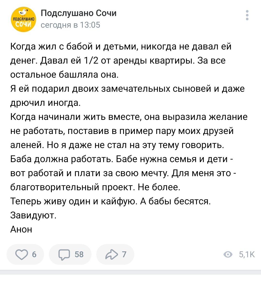 "Когда жил с бабой и детьми, никогда не давал ей денег. Давал ей 1/2 от аренды квартиры. За все остальное баш.ляла она. Я ей подарил двоих замечательных сыновей и даже ...... иногда. Когда начинали жить вместе, она выразила желание не работать, поставив в пример пару моих друзей аленей. Но я даже не стал на эту тему говорить. Баба должна работать. Бабе нужна семья и дети - вот работай и плати за свою мечту. Для меня это - благотворительный проект. Не более. Теперь живу один и кайфую. А бабы бесятся. Завидуют." Такое пост, и кучу подобных можно легко встретить в сети. Они всегда, как правило, анонимны. Видимо бояться гнева своей жены, так как в реальность написанного может поверить только "алень". Так почему и кто их пишет? Кто?-это обиженные жизнью (или точнее своей женой) особи мужчкого пола, которым не хватает в жизни свободы. Они вынуждены были рано жениться, как говорят в народе "по залету". В этом, опять же обвиняют жену, ведь сами то они никак не участвовали в процессе. Во