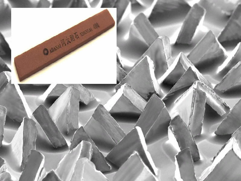 Здравствуйте уважаемые! Поговорим по зернистость заточных брусков. Собственно не важно какая система измерения применяется для определения размера зерна. Важны два основных параметра: форма зерна и его количество на единицу площади. Начнём с формы зерна. Я не буду сильно заглубляться во все эти кристаллические дебри. Для простоты обсудим две формы: треугольник и квадрат. В целом понятно что если у нас зерно имеет треугольную форму, то и съём будет наиболее интенсивный. Острая грань треугольного зерна легко впивается в обрабатываемый металл. С одной стороны это хорошо, быстрый съём металла и соответственно нож будет заточен быстрее. Но есть минусы такой формы. Прочность подобного зерна маленькая, поэтому оно быстро теряет свою высокую абразивность. Вторым минусом является как ни странно именно его производительность по съёму металла. Риски оставляемые подобным зерном достаточно глубокие и вывести их следующим зерном значительно труднее. Поэтому часто вместо треугольных зерен используют