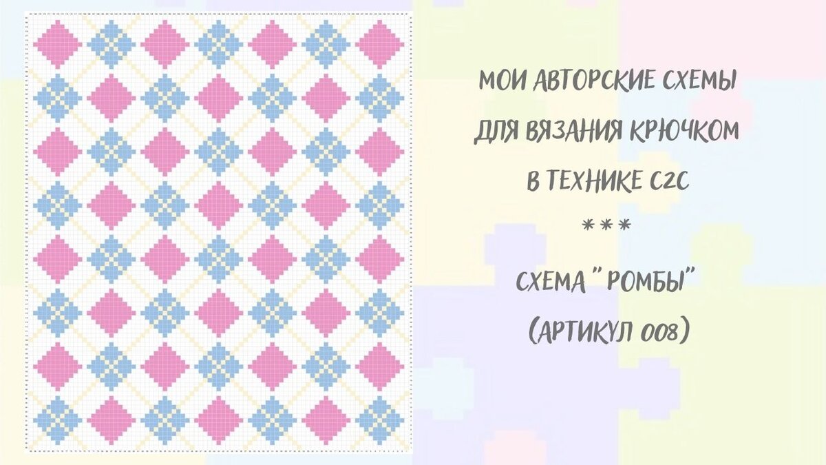 Схема для вязания крючком пледа в технике С2С (вязание из угла в угол, вязание по диагонали). Артикул: 008. Размер схемы: 85*97 клеток. Пример готового С2С пледа "Ромбы". О технике вязания крючком С2С. Если вы еще не знакомы с техникой вязания крючком из угла в угол, то по этим видео можно узнать о ней больше. Техника вязания крючком из угла в угол: Техника смены цвета во время вязания крючком из угла в угол: Как прятать кончики нитей на изнаночной стороне: Для тех, кто хочет попробовать начать вязать этот плед, есть небольшой бесплатный образец, который позволяет связать первые 30 рядов пледа. Письменное описание для бесплатного образца: ЛС - лицевая сторона. ИС - изнаночная сторона. ↙ - ход работы сверху вниз. ↗ - ход работы снизу вверх. Начинать вязать крючком плед в технике С2С надо с правого нижнего угла. Цвета (сокращения, применяемые в схеме): Описание по рядам (первые 30 рядов): ↙ Ряд 1 [ЛС]: (жел) x 1 (1 кл)