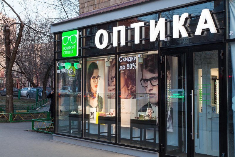 Большинство салонов оптики кроме вывески оформляет витрину. Витрина всегда вызывает интерес у прохожих, это эффективный способ привлечения потенциальных клиентов. Для магазина оптики нежелательно полностью закрывать витрину пленками с печатью или баннерами, специфика его работы такова, что в помещении должно быть светло при естественном свете.