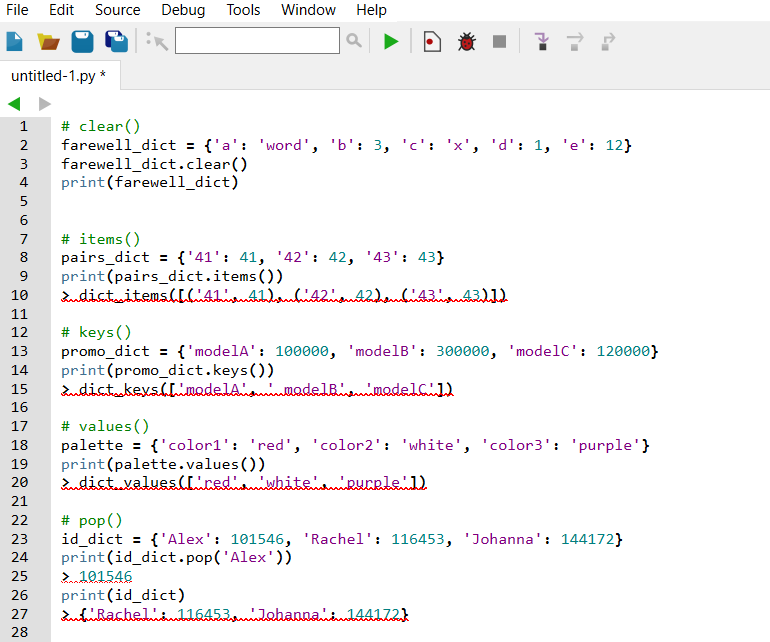 dict.clear() — очищает словарь. dict.copy() — возвращает копию словаря. classmethod dict.fromkeys(seq[, value]) — создает словарь с ключами из seq и значением value (по умолчанию None). dict.get(key[, default]) — возвращает значение ключа, но если его нет, не бросает исключение, а возвращает default (по умолчанию None). dict.items() — возвращает пары (ключ, значение). dict.keys() — возвращает ключи в словаре. dict.pop(key[, default]) — удаляет ключ и возвращает значение. Если ключа нет, возвращает default (по умолчанию бросает исключение). dict.popitem() — удаляет и возвращает пару (ключ, значение). Если словарь пуст, бросает исключение KeyError. Помните, что словари неупорядочены. dict.setdefault(key[, default]) — возвращает значение ключа, но если его нет, не бросает исключение, а создает ключ с значением default (по умолчанию None). dict.update([other]) — обновляет словарь, добавляя пары (ключ, значение) из other. Существующие ключи перезаписываются. Возвращает None (не новый словар