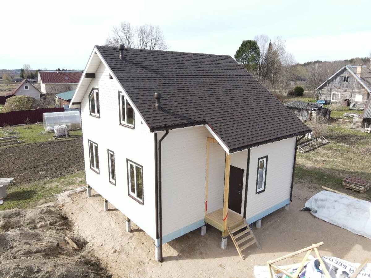 В мае 2022 года мы сдали дом по этому проекту в поселке Портовое Приозерского района (Ленинградская область). Использовалась бюджетная внешняя отделка, дом возводился на сваях.