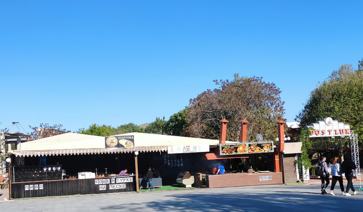 Название кафе, то ли "Люди", то ли "Шаурма", непонятно совсем. Находится на краю набережной. Выглядит так. ⬇️ На 9 мая, мы решили всё же посетить Судак. Ехать до него два с половиной часа, и мы успели проголодаться в дороге, ещё и собирались долго. Зашли в первое попавшееся кафе, привлекла надпись про самсу в тандыре, очень хотелось попробовать. Ни разу не ели её. Если честно мне сразу не понравилось кафе внутри, но девушка официантка сразу подошла к нам, усадила за столик, посмотреть меню. Так ведь будет удобнее. И когда мы уселись, а главное усадили детей, сообщила что самсы нет, но есть очень вкусная пицца. Ну чтож, давайте пиццу тогда. А лучше две! Цены такие. Пицца - 350-370. Фри -150. Нагетсы - 250. Чайник чая - 150. Молочные коктейли только мне показались дороговато для такого заведения, по 190 рублей, но муж сказал брать. И вот первым принесли чайник чая. И кофейные кружки! Ладно. Фиг с ним. Но когда я налила в кружку чай, там плавала заварка. Открыла чайник, и с