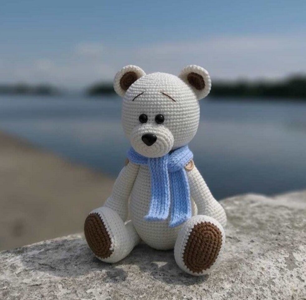 Очаровательный белый медвежонок амигуруми от Натальи Андросовой @androsova_toys. Высота готового мишки около 20 см при использовании крючка №1.75 и пряжи YarnArt Jeans. Конечности у игрушки подвижны благодаря использованию пуговичного крепления. Необходимые материалы: Условные обозначения: КА — кольцо амигуруми сбн — столбик без накида пр — прибавка (2 сбн в одну петлю) уб — убавка (2 cбн провязать вместе) Схема амигуруми мишка крючком Голова Вяжем пряжей основного цвета: 1: 6 сбн в КА (6) 2: 6 пр (12) 3: (1 сбн, пр)*6 (18) 4: 1 сбн, пр, (2 сбн, пр)*5, 1 сбн (24) 5: (3 сбн, пр)*6 (30) 6: 2 сбн, пр, (4 сбн, пр)*5, 2 сбн (36) 7: (5 сбн, пр)*6 (42) 8: 3 сбн, пр, (6 сбн, пр)*5, 3 сбн (48) 9: (7 сбн, пр)*6 (54) 10: 4 сбн, пр, (8 сбн, пр)*5, 4 сбн (60) 11: (9 сбн, пр)*6 (66) 12: 5 сбн, пр, (10 сбн, пр)*5, 5 сбн (72) 13: (11 сбн, пр)*6 (78) 14-26: 78 сбн (13 рядов) 27: (11 сбн, уб)*6 (72) 28: 5 сбн, уб, (10 сбн, уб)*5, 5 сбн (66) 29: (9 сбн, уб)*6 (60) 30: 4 сбн, уб, (8 сбн, уб)*5, 4 сбн