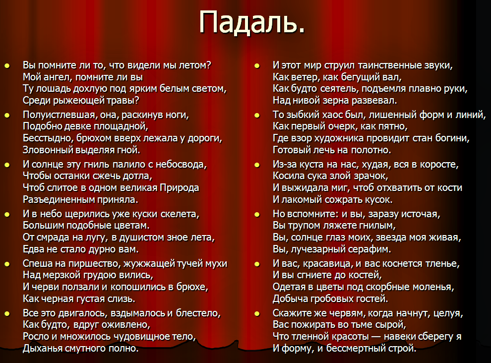 Среди рыжеющей травы? Может показаться, что это метафора и Бодлер говорит о своей возлюбленной, однако после тщательного изучения этого произведения любому человеку станет понятно то, что автор говорит не о прекрасной девушке, гулявший с ним, а своей душе, о своем внутреннем ангеле. Шарль Бодлер, в свойственной ему манере, заявляет, что в одной из тех прекрасных прогулок, в которых авторы разбираются сами в себе, в своей душе, размышляют над будущими замыслами и идеями, он обнаружил падаль. Падаль внутри себя. И сегодня он обратил эти воспоминания на бумагу. Полуистлевшая, она, раскинув ноги,