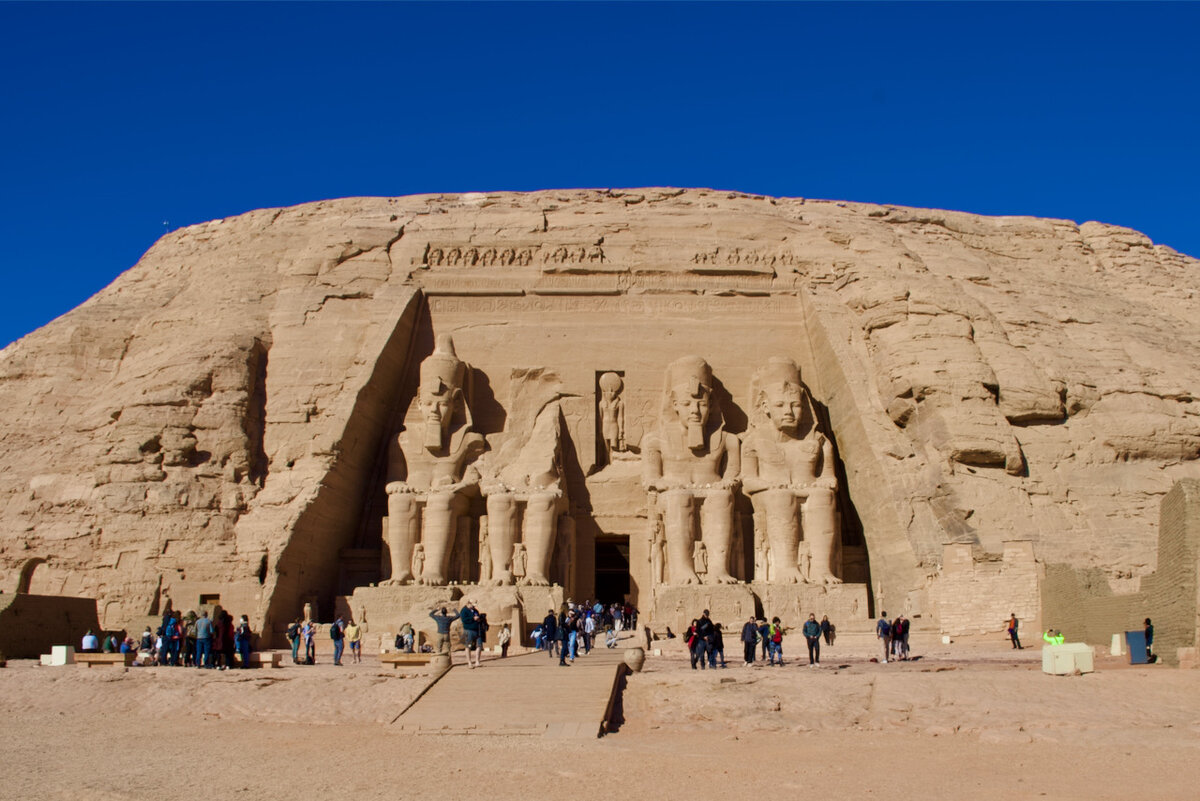 Большой храм, храм Рамсеса II, строили 20 лет. В 100-метровой горе вырубили сооружение 35 метров в длину и 30 метров в высоту. При входе в храм стоят 4 громадные 20-ти метровые статуи – три из них богов Ра-Хорахти, Амона и Птахи, которых фараон считал своими покровителями, одна самого Рамсеса II. Но так как он воспринимал себя не больше не меньше – а равным богам, то все статуи имеют портретное сходство с Рамсесом.