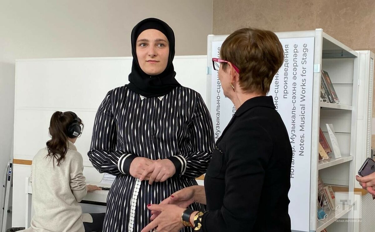 Фото: Регина Яфарова Дочь главы Чеченской Республики Рамзана Кадырова Айшат Кадырова, возглавляющая Министерство культуры региона, прибыла в Казань. Она примет участие в мероприятиях, приуроченных ко Дням Чеченской Республики в Татарстане, в том числе и в открытии 12 мая выставки «Искусство Чеченской Республики XIX–XXI веков» в Центре «Эрмитаж-Казань». Накануне вернисажа Айшат Кадырова познакомилась с достопримечательностями столицы Татарстана и побывала в Национальной библиотеке РТ. Экскурсию по недавно обновленному зданию, выдержанному в стиле позднесоветского модернизма, для министра культуры Чечни провела директор Национальной библиотеки Мадина Тимерзянова. Отвечая на вопрос корреспондента «Татар-информа» о потенциальной презентации в столице Татарстана не только музея Чечни, но и линии одежды бренда, которым владеет Айшат Кадырова, гостья ответила утвердительно. «Я считаю, что мусульманская мода и мировая мода уже давно друг с другом дружат. Это видно по показам домов высокой мод