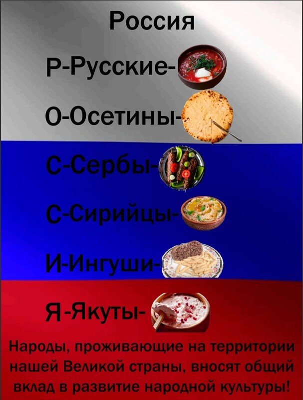 На территории РФ проживает более 130 млн человек, более 50 народов со своей историей, обычаями и культурой! Несмотря на различие, всех нас объединяет одно - любовь к кухне! А у каждого народа своя непревзойденная национальная кухня, которая является частью ОДНОЙ БОЛЬШОЙ КУЛЬТУРЫ! Бариновский Иван СОШ №23, 11 а класс Арт-трек «Арт-директор», Рекламный плакат