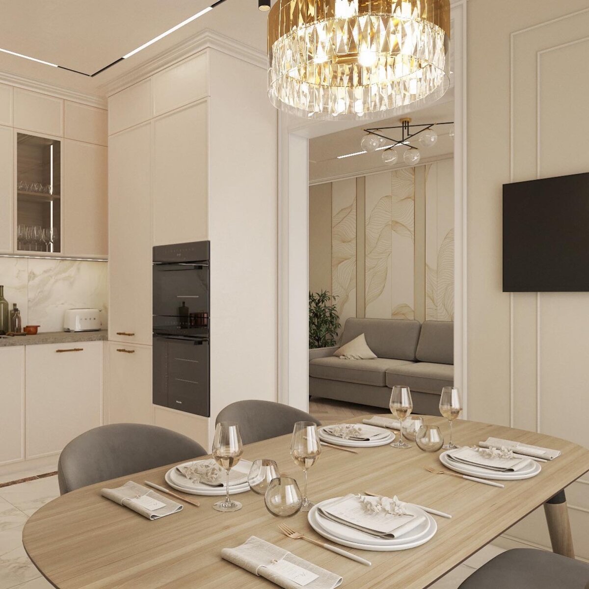 Проект кухни 14.2 м.кв в ЖК «Инкери» Спокойные природные оттенки серого, бежевого, коричневого и аккуратные молдинги ❤️ Кухонный гарнитур получился редкой конфигурации - буквой «П» - это один из самых эргономичных вариантов! Проект начали реализовывать 🙌🏻🥳 ——————————————— Заказать дизайн - проект: 📞 89312086220