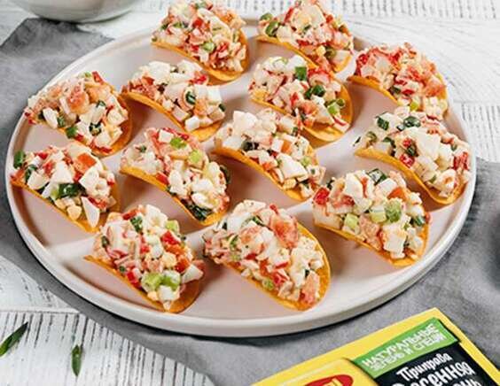 Способов приготовления крабового салата множество, но как сделать обычное блюдо праздничным? Секрет кроется в ингредиентах и подаче. Крабовые палочки, моцарелла, яйца и помидоры в легком пикантном майонезном соусе на хрустящих чипсах – блюдо, перед которым не устоит ни один гость. Чтобы чипсы дольше оставались хрустящими и чтобы они не размокли, положите на чипсы листья, а затем листья салата. Подписывайтесь на мой канал кстати) Для приготовления нам понадобится: Рецепт: 1. Отварить яйца вкрутую. Очистите и нарежьте небольшими кубиками. 2. Нарежьте крабовые палочки и моцареллу небольшими кубиками. 3. Репчатый лук нарезать небольшими кубиками. 4. Удалите из помидора жидкую часть и семена и нарежьте небольшими кубиками. Смешайте горячую воду с приправой в небольшой миске и оставьте на три минуты. 5. Соедините в миске яйца, крабовые палочки, моцареллу, лук, помидор, майонез и приправы и тщательно перемешайте. Выложите салат поверх чипсов и подавайте! Приятного аппетита!