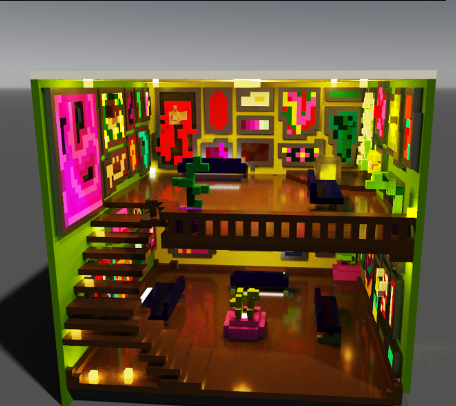 3D модель картинной галереи, с расстановкой предметов, с учётом освещения и цветовой гаммы помещения.