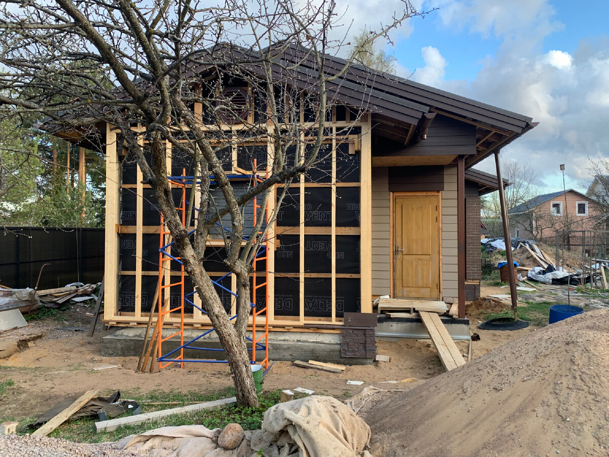 Возникла необходимость выполнить облицовку фундамента цокольными панелями типа DOCKE как и на остальном доме. Старый фундамент был на редкость кривой. Решил попробовать устроить из доски обвязку для крепления верха панели(крепление на саморезы к доске 30 мм).Для возможности крепления нижней части панели к фундаменту решил выполнить обетонку нижней части фундамента в плоскости наружного края обвязки из доски. На обвязку из доски ставится деревянный каркас под будущую облицовку фиброцементными панелями. Эту работу я в данной статье не описываю. Далее купил кладочную сетку с ячейкой 50х50 мм ( размер 0,5х2,0 м). Разрезал сетку пополам по ширине , загнул концы консольных участков проволоки. Навесил на штыри, зафиксировал вязальной проволокой. Изготовил из старых половых досок щиты опалубки высотой 300 мм. Затянул пленкой лицевую поверхность. Установил щиты, упирая в грунт и прижимая к торчащим штырям- автоматом выставило в нужную плоскость. Для фиксации забил доски в грунт и закрепил кон