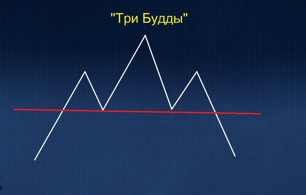 Один из способов анализа рынка, пришедших из Японии, называется методом Саката. В его основе лежит набор графических форм, позволяющих взглянуть на рынок более широко, не отвлекаясь на незначительные колебания, происходящие внутри тенденций. К таким формам относятся «Три горы», «Три реки» и «Три будды». Столь пристальное внимание к этому количеству связано с особенностью японской культуры, в древней Японии цифре 3 приписывались магические свойства. Существует даже поговорка: «Три раза везёт». «Три будды» Эти формы, в отличие от предыдущих, образуются как на вершине, так и в основании рынка. «Три будды» очень похожи на «Три горы», но с той лишь разницей, что самая высокая — средняя вершина. Своё название форма получила в силу схожести очертаний со статуями в буддийских храмах, где в центре находится большой будда, а по краям — два поменьше. Эта фигура считается достаточно сильной разворотной, и подтверждением хода также выступает закрытие свечи за линией, обозначенной красным цветом. У