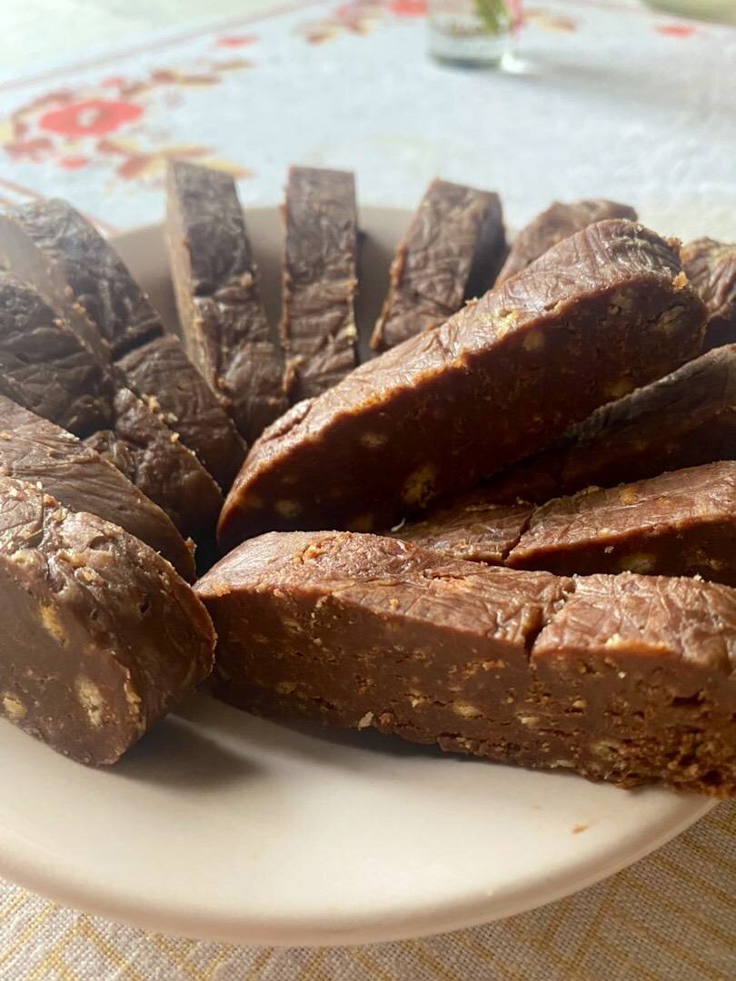 #десерт #десертбезвыпечки Ингредиенты: Печенье «топленое молоко», Порошок-какао «Красный октябрь», Тёплое молоко, Растопленное сливочное масло, Сгущенное молоко, Сахарная пудра Способ приготовления: Измельчаем печенье в пакете с помощью скалки, если нет блендера. У нас, как Вы видите, его нет, размельчили плохо, но на вкус никак не повлияло 😂 В миску с измельченным печеньем добавляем какао, сахарную пудру, все перемешиваем ложкой. Следом добавляем все жидкие ингредиенты: растопленное масло, тёплое молоко, сгущенку, также мешаем, в процессе станет тяжело мешать ложкой, переходите на ручной замес. Мы колбаски катали с помощью пищевой пленки, можно в пакете, можно слепить стандартное пирожное - круглое или овальное, в общем на ваш вкус🥰 Можно покрыть глазурью или кремом!) Как все сделали, ставим стабилизироваться в холодильник на 1-2 часа, желательно, на ночь. Приятного чаепития!🌾🌷