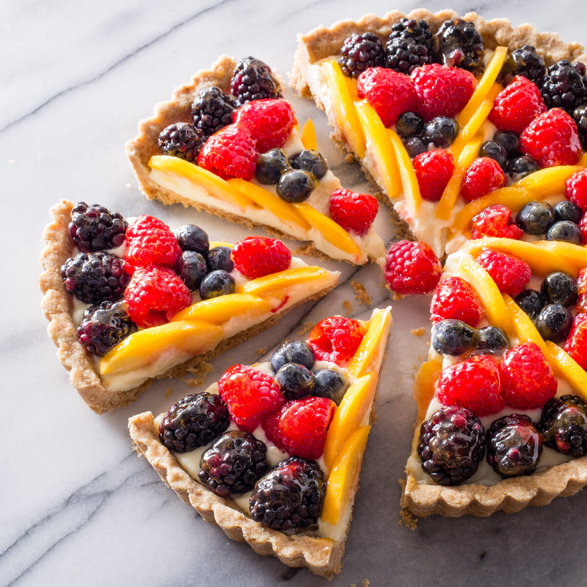 Фруктовый пирог из песочного теста наполнен заварным кремом и украшен клубникой , мандаринами , киви, манго, черникой и малиной. Несмотря на то, что это требует некоторой работы, приготовление может быть легким благодаря нашему подробному рецепту. Это просто требует некоторого внимания к деталям.