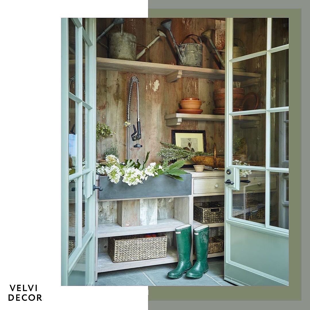Тема вдохновляющего загородного декора была бы неполной без упоминания садовой "кухни" - функционального и красивого пространства для садоводческих экспериментов. Кто не мечтает обустроить комфортное рабочее место посадки-пересадки растений, где предусмотрены: садовый стол с мойкой и встроенной ёмкостью для грунта, стеллажи для рассады и продуманная зона хранения с полками для всевозможных терракотовых горшков, удобрений и инструментов.