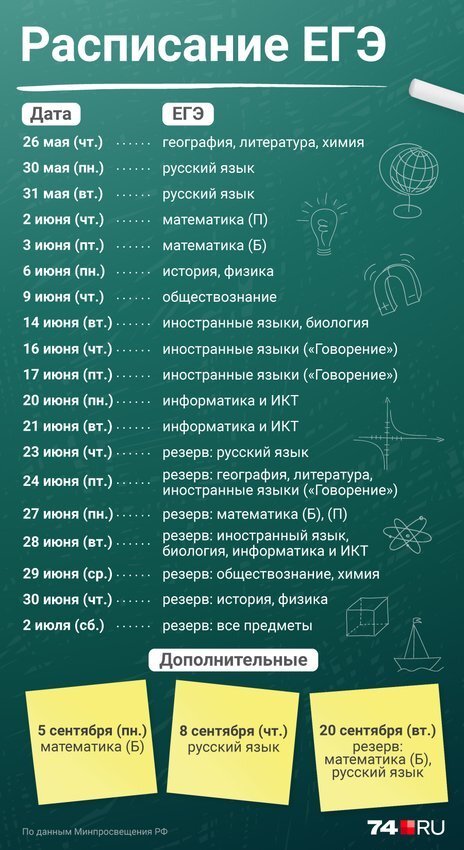 Основной период единого госэкзамена начнется 26 мая. ЕГЭ в этом году начнется 26 мая с экзаменов по географии, литературе и химии Фото: Александр Ощепков / NGS.RU Первый экзамен основного периода начнется 26 мая, в этот день у одиннадцатиклассников проверят знания географии, литературы, химии. В этом материале отвечаем на вопросы, связанные с ЕГЭ, и публикуем расписание. В какие дни будет ЕГЭ? ЕГЭ в этом году пройдет в два этапа. Основной — с 26 мая по 21 июня. С 23 июня по 2 июля — резервные дни. На дополнительный этап заложены три дня: 5, 8, 20 сентября. ЕГЭ надо сдавать всем? В прошлые пандемийные годы, напомним, ЕГЭ не был обязательным. Его сдавали только те ученики, которые собирались поступать в вуз. В этом году госэкзамены по русскому языку и математике сдают все, так как они являются обязательными для получения аттестата. И по необходимости выпускники сдают те предметы, которые нужны для поступления в высшее учебное заведение, объяснили в Региональном центре оценки качест