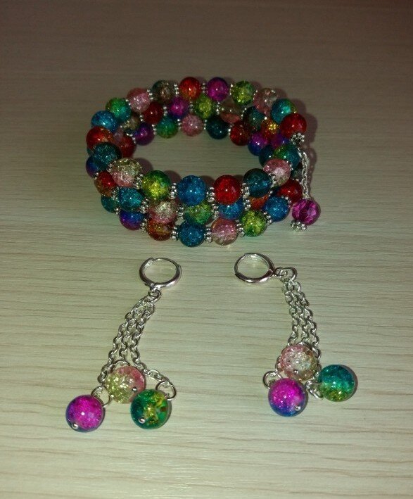 Получила посылку с чудесными акриловыми бусинами - красивые, переливаются всеми цветами радуги. Собрала из них комплект — браслет и серьги.