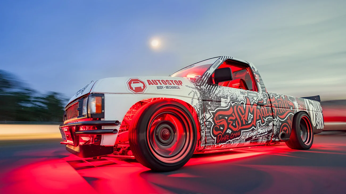 Помимо блока GM LS2 с инжекторами от LS7 и распредвалами LS9 пикап получил ЭБУ от KLtunes, кастомную выпускную систему, задний мост Dana 44, вынесенные в грузовой отсек радиаторы, рулевую рейку от Subaru... И это далеко не весь список переделок. Вишенкой на торте стала красная светодиодная подсветка, которая делает дрифт-пикап ещё эффектнее.