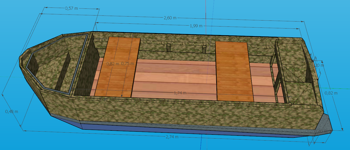 Всем привет, решил описать свою идею постройки лодки, и ее практическое воплощение. Итак, все время пользовался на охоте восьмиклинкой, на охоту ездим с братом две лодки перевозим в собранном состоянии на багажнике. Собственно, это и стало основной отправной точкой какую лодку я хочу: 1. Лодка должна быть достаточно легкой чтобы в одного можно было погрузить ее на багажник автомобиля; 2. Лодка должна хорошо идти по камышу и быть остойчивой на воде; 3. Хранить лодку планирую в гараже, подвешенной к потолку под ней будет стоять машина, соответственно появляется ограничение по высоте борта. Из этих вводных в SketchUp попытался нарисовать проект будущей лодки. Строить решил из пеноплекса, склеивая его клей пеной и затем покрывать стеклопластиком из стекловолокна и эпоксидной смолы, с последующей обработкой и покраской. 13 апреля начал реализацию данного проекта, закупил необходимые для начала работ материалы. Так как работать лучше в комфортных условиях, то решил сделать стол, на котором