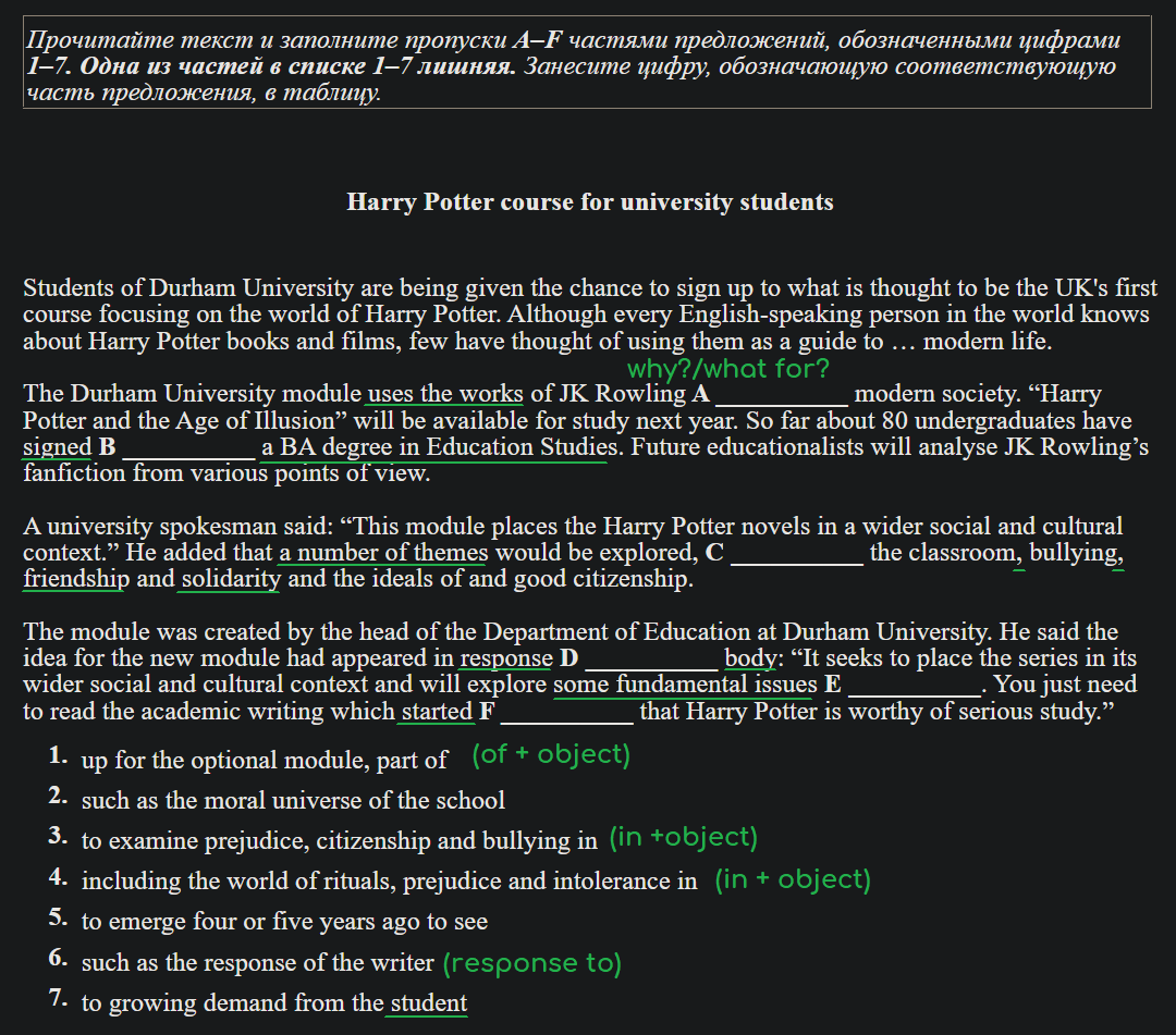 Задание номер 11 проверяет знание структурно-смысловых связей в тексте. Т.е. вам необходимо понимать структуру текста (введение, аргументация/описание, заключение - 3 основных части текста). А также грамматические структуры (союзы, сложные предложения, относительные местоимения, сравнительные конструкции и т.д.) И самое важное читать предложение до и после пропуска, а в идеале весь текст. Никогда не нужно читать только предложение с пропуском! ОТВЕТЫ И ДЕТАЛЬНОЕ ОБЪЯСНЕНИЕ 🔽 A) Всегда можно задать вопросы к пропуску. Университет использует работы J.K. Rowling для чего?/почему? После пропуска подсказка - существительное (точнее прилагательное + сущ). И ответ на вопрос почему дает частица to - чтобы. Соответственно есть три варианта 3/5/7. Когда возникает такая ситуация, то лучше записать все варианты и перейти к следующему пропуску, где ответ может быть более очевиден, но здесь по смыслу подходит только один вариант. Ответ: 3 B) Тут все просто - фразовый глагол sign up (записаться