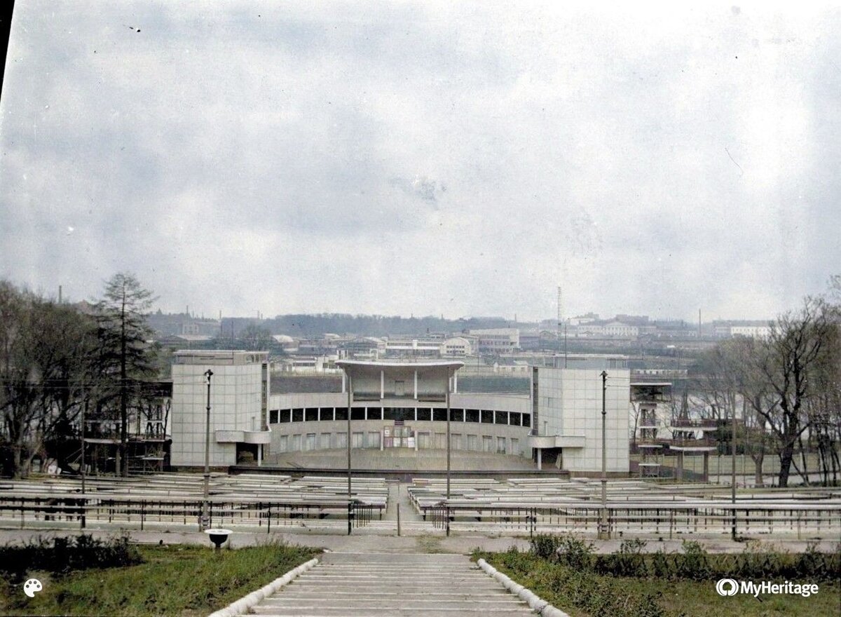 В 1933 году на границе Парка Горького и Нескучного сада построили театр под открытым небом. Он сразу стал пользоваться у москвичей большим спросом. И сейчас летом тут проводят различные мероприятия. Правда деревья вокруг сильно выросли и нет уже того ощущения перспективы.