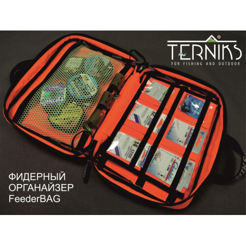 Как навести порядок в фидерных аксессуарах? Многие из Вас постоянно мучаются проблемой сохранности и правильной транспортировки фидерных аксессуаров. Таких как поводочная леска, крючки, инструмент для вязания поводков. Не нужно нести домой всё снаряжение – берем только крючки и леску для новых поводков в ФИДЕРНОМ ОРГАНАЙЗЕРЕ FeederBAG от ТЕРНИКС! Теперь у Вас есть ФИДЕРНЫЙ ОРГАНАЙЗЕР FeederBAG! • 12 прозрачных карманов под крючки • Большой сетчатый карман под поводочные лески • 2 кармана под инструменты и фидергам • Надежная молния и 2 бегунка SBS • Система Molle для крепления ФИДЕРНОГО ОРГАНАЙЗЕРА на кресло • Широкий выбор по цветовому решению Органайзер изготовлен из прочного материала Оксфорд 1680 с пропиткой PU 1000. Размеры наружные: 32*24*7,5 см Отдел для крючков вмещает в себя 6 пачек крючков с одной стороны и 6 пачек с другой.