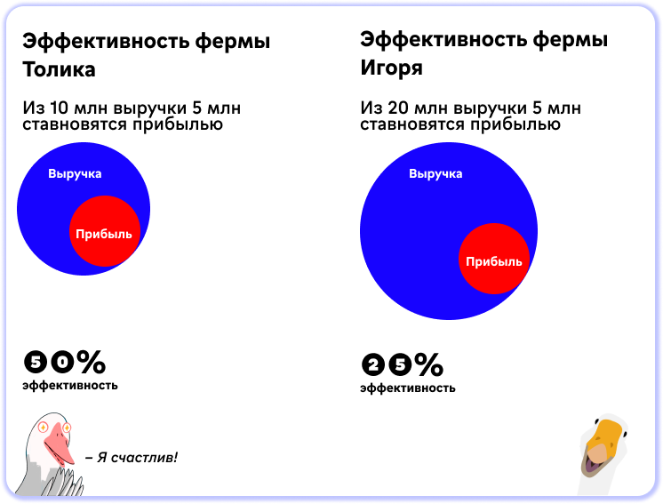 Хоть прибыль у наших гусей одинаковая, между ними и есть разница: Толик каждый месяц получает 10 млн выручки, из которых 5 млн становятся прибылью, а Игорю для такого же результата приходится организовывать 20 млн выручки. И если бы они мерились не прибылью, а эффективностью, Толик победил бы с отрывом в +25%. Что за эффективность и как мы ее посчитали рассказываем в статье.
