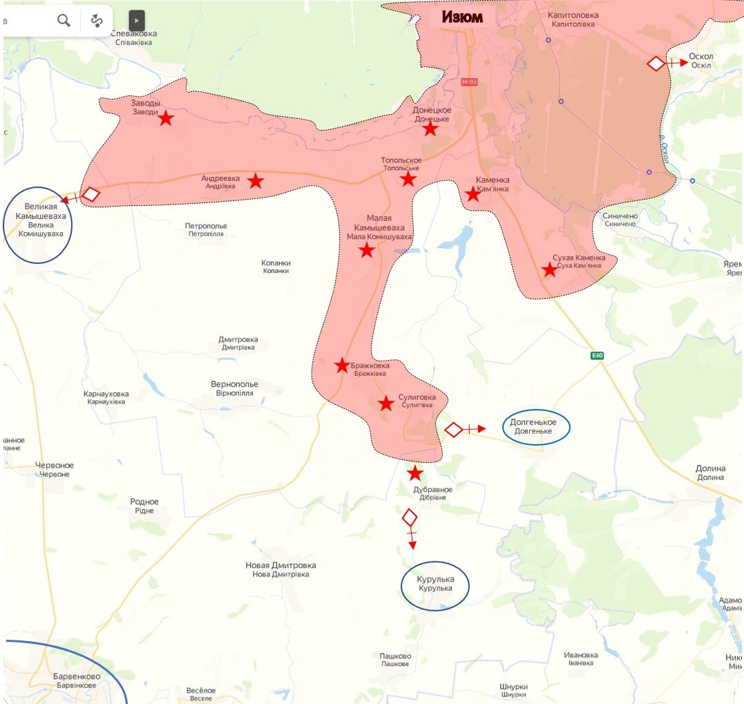 Продвинувшись от Изюма в западном направлении по обе стороны Северского донца, ВС РФ взяли Заводы, тем самым отодвинув ВСУ от понтонной переправы в Донецком. Линия фронта здесь подошла к Великой Камышевахе.