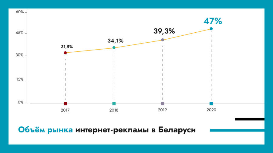 Первое, на что обратим внимание, — объём рынка интернет-рекламы, так как SMM является его частью. Например, по данным IAB Беларусь за 2020 год, популярность digital-рекламы растёт ежегодно. В настоящее время её доля от медийного рынка Беларуси составляет 50%.