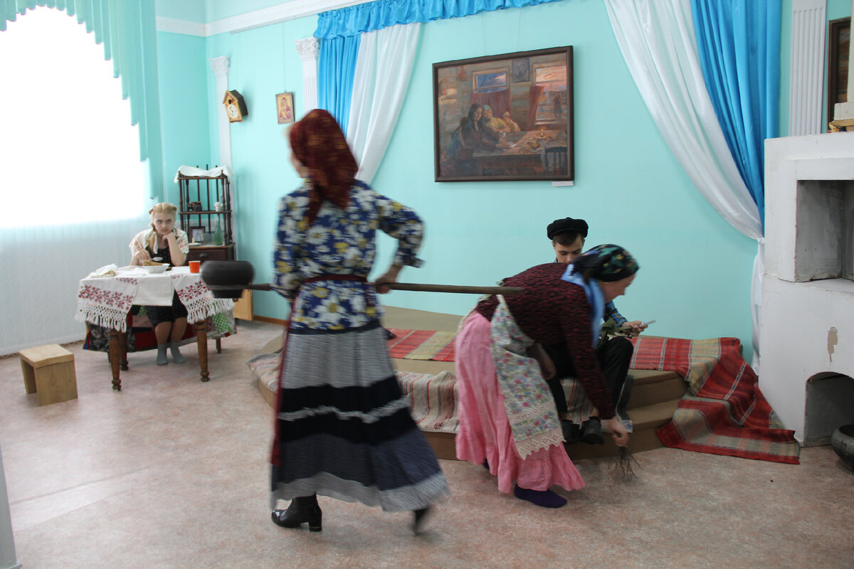 «История одной картины» - это творческий проект историко-краеведческого музея. В канун 9 Мая вниманию зрителей была представлена театрализация по мотивам картины А.А. Куроедова «Утренний свет». Работники музея и артисты раздвинули рамки замысла художника, чтобы глубже показать, как сибирячки умели ждать, как они приближали Победу. На картине женщина с тремя детьми сидит за столом, утро, а свеча еще горит. На столе нехитрая военная еда – кусок хлеба. Но не до завтрака семье: пришло письмо с фронта от главы семьи, а может, это похоронка. Лица всех печальны. Мария в задумчивости, она вспоминает, как провожала Ивана на фронт. С картины художника переводим взгляд на живую картину. Будний день крестьянской семьи – мать (С. Готовец), жена (И. Шелудкова) и сестра (А. Евстигнеева) Ивана (В. Афанасьев) хлопочут по хозяйству, а он собирается на ферму. Вдруг сообщение по радио: началась война. И вот уже Миронову Ивану Дмитриевичу почтальон (В. Климова) приносит повестку. Быстрые сборы, мате