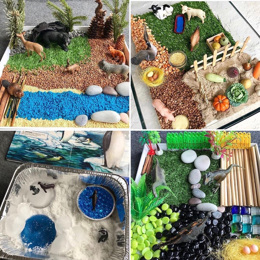 Сенсорные коробочки для Лёвы я делаю ещё с 9-10 месяцев. Самые первые - это контейнеры с разными предметами одной темы, например, мячики разных цветов, материалов и форм, или природные коробочки с шишками, каштанами, веточками, желудями. ⠀ После 2 лет появились коробочки тематические: саванна, Арктика, динозавры, джунгли, лес. 🔸Зачем делать #сенсорныекоробки если их все равно малыш разворотит? ⠀ ✅В этом и суть: мы даём коробочку и разрешаем делать то, что хочется ребёнку. Смешивать наполнение, пропускать через ладошки, пересыпать совочками, кормить животных и тд. ⠀ ✅Детям постарше можно рассказать про среду обитания, показать книги и картинки по теме. ⠀ ✅разнообразие тактильных ощущений стимулирует развитие мозга и речи, а тематика коробочки расширяет кругозор малыша. ⠀ Для меня вопрос, делать ли такие коробочки не стоял никогда: конечно делать! Обычно на коробочку уходит от 10 до 30 минут. ⠀ В ход идут крупы, природные материалы, камушки и стекляшки из #fixprice. В качестве деревьев
