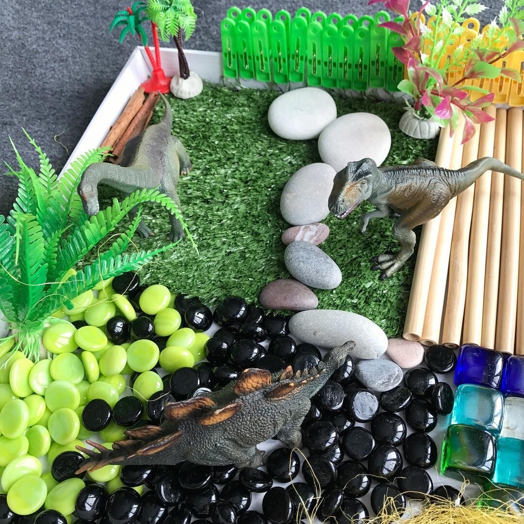 Делюсь с вами сенсорной Дино-коробкой, которую сделал мой сын сам в 4 года! Ладно-ладно, я чуть-чуть его направляла 😂🙈. ⠀ Самый главный плюс этой коробочки: максимальная простота изготовления и отсутствие уборки, так как никакого песка и крупы здесь нет👍. ⠀ Итак, что нам понадобится: 🦖 фигурки динозавров: у нас gulliver collecta. 🦕 коврик-травка из #fixprice. 🦖стеклянные камушки (я брала в отделах декора для дома, они же есть в зоомагазинах - наполнение для аквариумов), голубые камушки брала тоже в фиксе. 🦕пальмы и другая джунгли-растительность. Это искусственные растения для аквариумов, есть в любом зоомагазине. Я брала на майшоп по цене 50-100 р за штуку. 🦖любые палочки, веточки, у меня бамбуковые палочки. 🦕сизаль для «гнезда» динозавра. 🦖камушки галька. ⠀ Сын ещё сам принёс зеленые и желтые прищепки и сделал вот такую «живую изгородь» по периметру коробки. ⠀ Всем, кто боится уборки после сенсорной коробки, однозначно рекомендую сделать эту быстро-коробочку👍. ⠀ Если было п