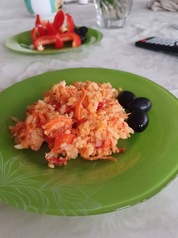 Оригинальный рецепт риса. Можно подавать как отдельное блюдо. Можно с любым мясным или рыбным блюдом. Ингредиенты: Рис , Морковка, Помидорка, Перец болгарский, Парика молотая , Соль , Яйца, Растительное масло для тушения овощей Способ приготовления: Рис в пакетах отварить, по инструкции на коробке. Как правило в 2 л воды подсоленной воды в течение 15-20 минут. Пока рис варится - готовим овощи. Нарезаем кубиками помидору и перчик. Морковку натираем на крупной терке. Сковороду разогреваем, добавляем масло. Выкладываем овощи обжариваем примерно 5-7 минут до мягкости. Добавляем рис, перемешиваем. Посыпаем паприкой. И вбиваем сверху 2 яйца. И быстренько еще раз все перемешиваем, чтобы яйца схватились. Тушим еще 3 минутки. Рисовый гарнир готов! Приятного аппетита!