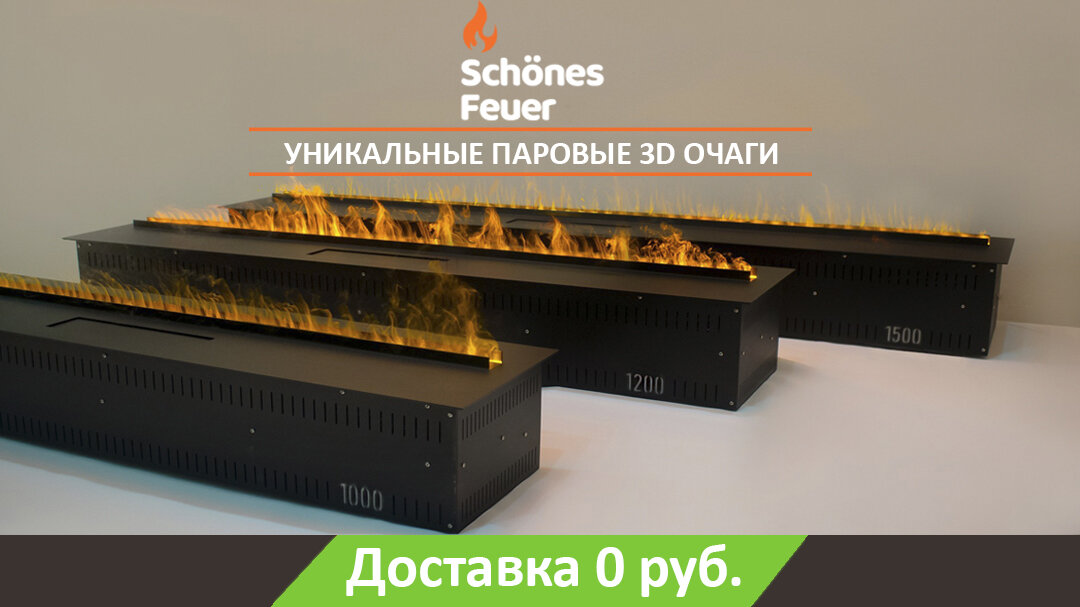 У нас сейчас проходит акция - доставка 0 рублей Представляем вашему вниманию уникальные паровые электрокамины. Производственная линейка Schönes Feuer (Шон Фаер) насчитывает самый широкий размерный ряд: 600, 800, 1000, 1200,1500, 2000, 3000, 4000 см Преимущества очага :