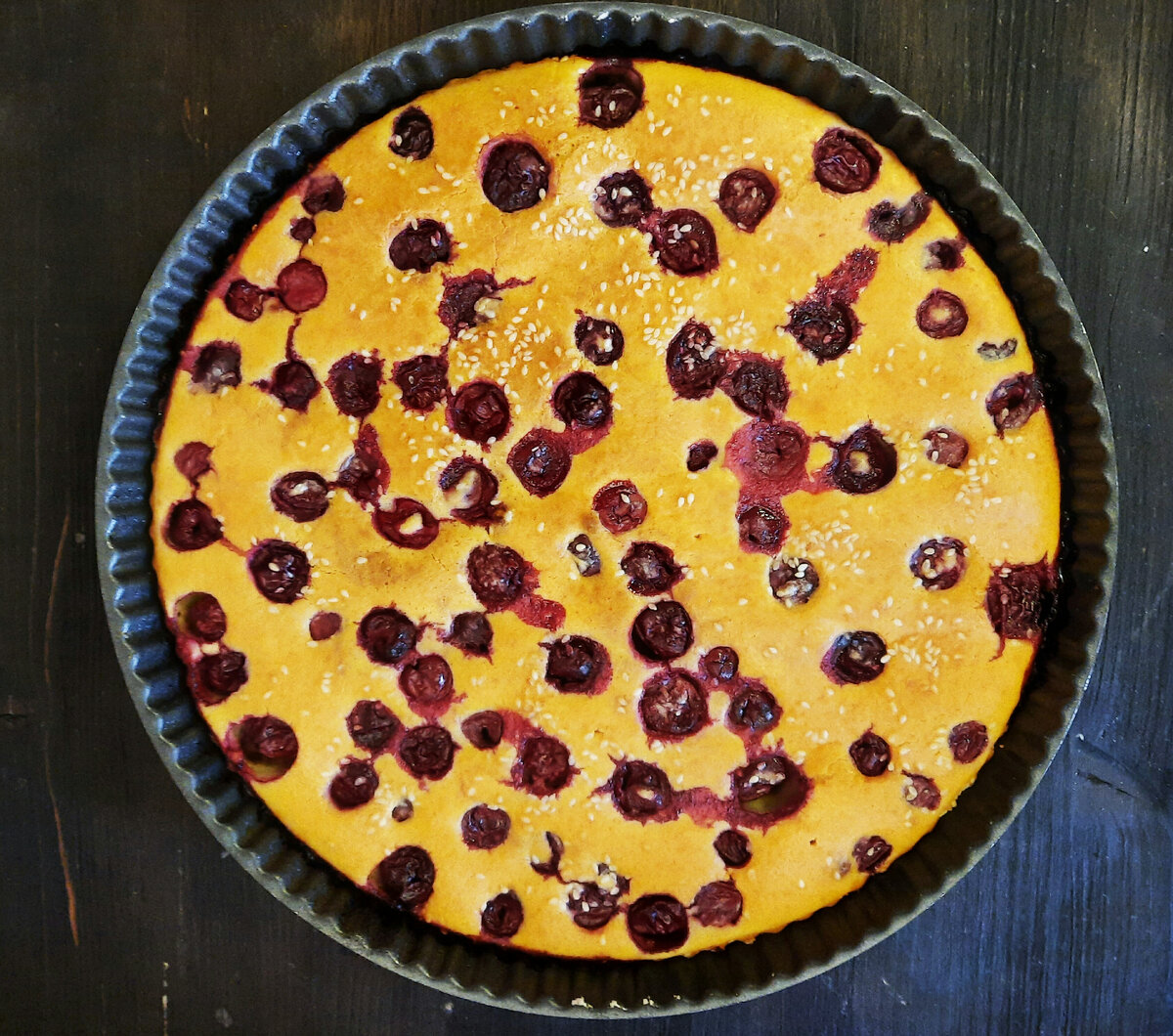 Форму (лучше широкую и низкую, как для тарта), сбрызнуть маслом, на дно выложить равномерно, одним слоем, вишню, залить тестом и выпекать в разогретой до 180С духовке 35-40 минут.