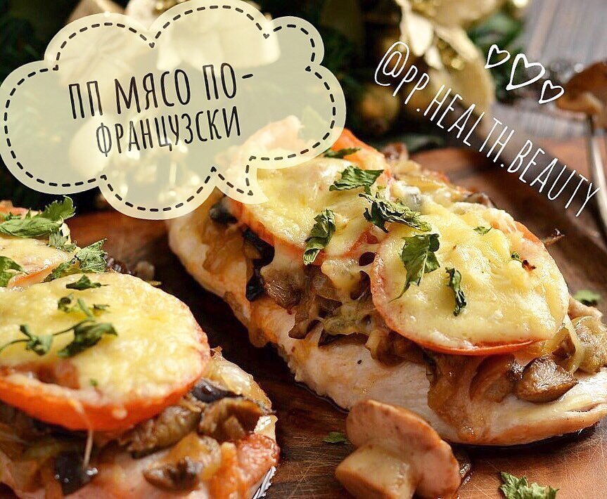 ⏰ Время приготовления: 40 минут ✅Итого на 100 грамм 100 ккал ✅Б/Ж/У 15 / 2 / 2 ✅Ингредиенты: • куриное филе — 2 шт. (250 г) • помидор 2 шт. • репчатый лук — 2 шт. • яйцо куриное — 1 шт. • сыр любой нежирный и твердый — 100 г • натуральный йогурт 1 ст. л. • перец черный молотый, соль PS можно добавить грибочки в рецепт ✅Приготовление: Для приготовления мяса по-французски из курицы филе порезать на тоненькие кусочки. Отбить. Кусочки курицы сложить в миску и помыть. Яйцо взбить, добавить к курице, посолить, поперчить и перемешать. Помидор порезать кружочками. Лук порезать кольцами. Сыр потереть на крупной терке. Противень смазать растительным маслом (можно на противень положить пергаментную бумагу ). На противень положить первым слоем курицу. Вторым слоем мяса по-французски будут кольца лука. На лук положить кружочки помидоров. Помидоры смазать йогуртом. Последним слоем будет тертый сыр. Запекать в духовке до золотистого цвета сыра