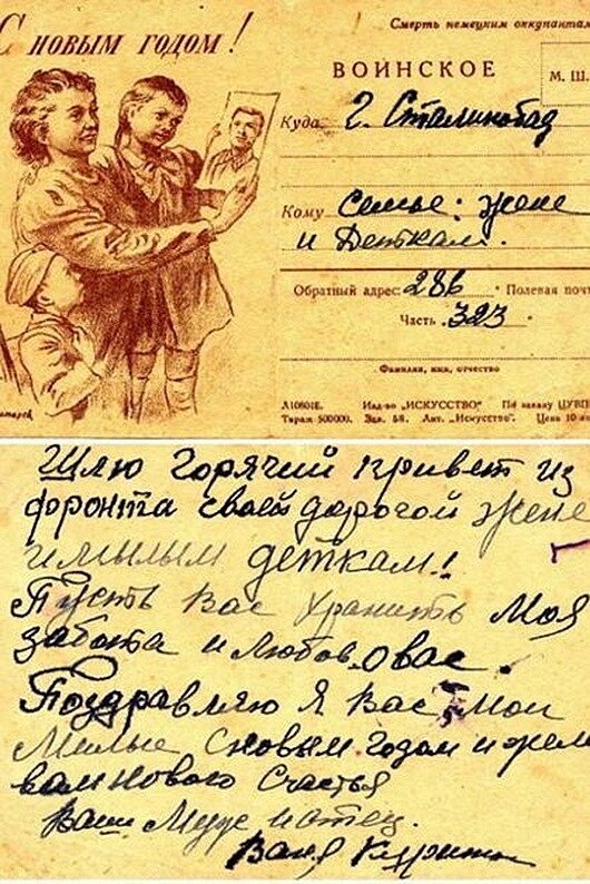 Шлю я вам свой привет и поздравляю с Новым годом! Рисунок - карточку Тимофея получил, хорошо нарисовал, молодец! Спасибо, сынок, за весточку твою. Учись хорошо. Скучаю по вам. Надеюсь, что в следующем году мы всё же разгромим германский империализм. Остаюсь пока на старом месте и работаю всё так же. Жив и здоров, чего и вам желаю.