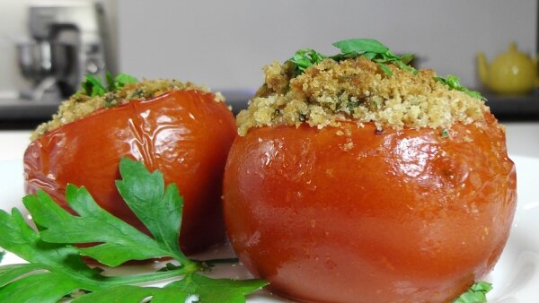 Приготовлено по рецепту из "Кулинария" 1955 г. изд. ПОМИДОРЫ, ФАРШИРОВАННЫЕ ХЛЕБНЫМИ СУХАРЯМИ Мелко измельчить сухари. Изрубить зелень петрушки и чеснок и, заправив маслом, перемешать с сухарями. С помидоров снять верхушку, отжать их от сока и семян, посолить, посыпать перцем и нафаршировать. Сверху сбрызнуть помидоры маслом и запечь в жарочном шкафу. Помидоры 2 шт., сухари 50, масло сливочное или маргарин сливочный 20, чеснок 2, зелень петрушки 5, перец. В видео рецепте: Помидоры 4 шт. Сухари 100 г. Масло сливочное 40 г. Чеснок 2 зуб. зелень петрушки 10 г. Соль перец. 2-ве порции, запекалось 35 минут при температуре 185*С, время приготовления 50 минут.