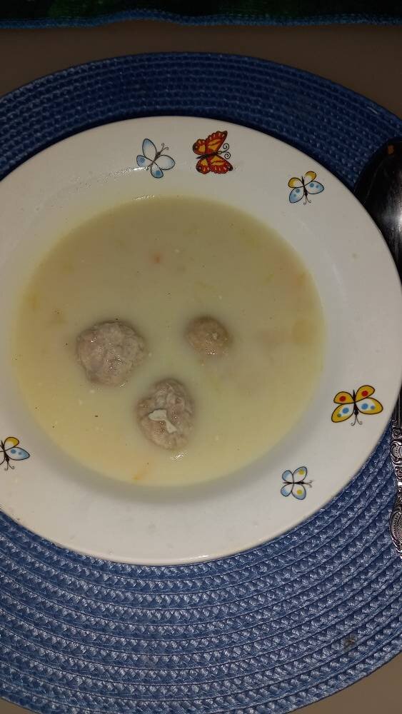 #непп Ингредиенты: воды, картофелины, небольшая морковка, небольшая луковица, плавленого сыра, соль, специи, готовых фрикаделек (были домашние замороженные) Способ приготовления: Поставить на огонь воду. В кипящую воду положить фрикадельки, посолить и варить до полуготовности. В это время картошку нарезаем произвольно и кидаем к фрикаделькам. Обжариваем на небольшом количестве масла лук и морковку, отправляем в бульон. Даём супу закипеть и пусть варится до готовности всех ингредиентов. В самом конце добавляем плавленый сыр и мешаем до полного растворения. Выключаем плиту, суп с фрикадельками не кипятим. Даём настояться, разливаем по тарелкам и кушаем очень вкусный суп😋.