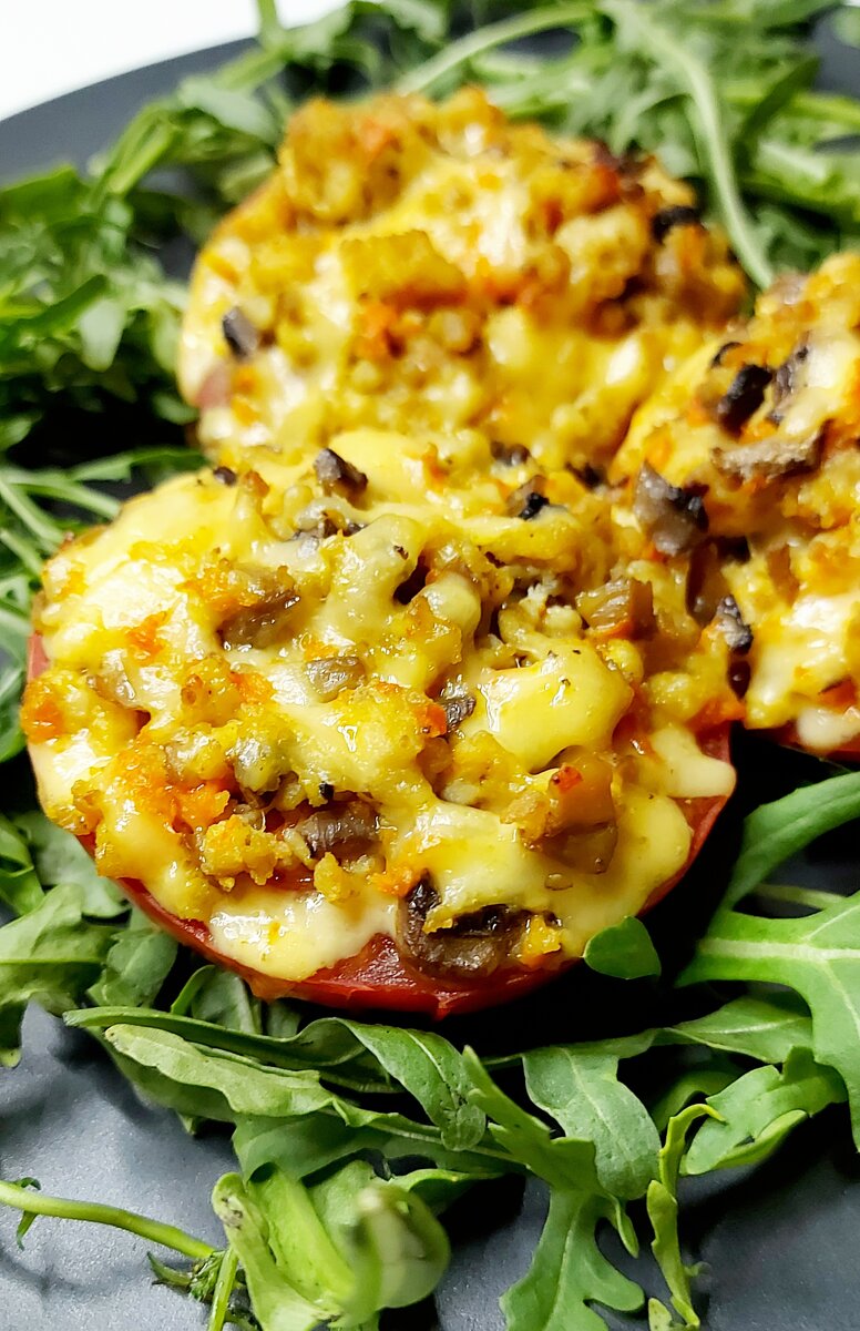 Приготовила на ужин фаршированные помидоры. Блюдо получается сочным, ярким, очень вкусным, лёгким и в то же время сытным. А главное, готовится легко и просто. Отличное решение для вечернего приёма пищи. Подать можно с зеленью или любым гарниром. Ну и для праздничного стола в виде закуски будет идеально смотреться - сметут со стола мгновенно. Ингредиенты: 1. Куриный фарш - 400 гр. 2. Шампиньоны - 250 гр. 3. Лук - 1 шт. 4. Морковь - 1 шт. 5. Сыр твёрдый - 200 гр. 6. Помидоры - 7-8 шт. 7. Соль, перец чёрный - по вкусу. 8. Масло растительное - немного 9. Масло сливочное - 15 гр. Приготовление: 1. Для фарша я использовала куриное филе бедра. Фарш обжарить 3-4 минуты на среднем огне на небольшом количестве растительного и сливочного масла. 2. Добавить мелко нарезанный лук, натёртую морковь и мелко нарезанные шампиньоны. 3. Обжарить до готовности. В конце посолить и поперчить по вкусу. По желанию можно добавить сушёный чеснок. 4. Фарш переложить в миску и дать остыть. После чего добавит