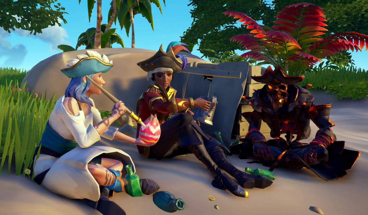 Оказывается, над разгадкой тайны "Убежища Морского волка" в компьютерной игре "Sea Of Thieves" ломали голову многие пираты. Я набрела на эту загадку случайно и разгадала её только благодаря своей дотошности. Во-первых, совсем недавно я была на острове "Убежище морского волка" (квадрат C11) и там не было ничего особенного. Вчера, я встретила там нового персонажа. Эту Девушку зовут Леседи (по центру): Эта милая (по самые ушки накачанная грогом) пиратка ни в какую не готова общаться. Но справа от нее можно обнаружить скелет ... предположительно это ДеМарко. Рядом играет музыкальная шкатулка. Идя от неё по следам вдоль берега можно обнаружить записку. В ней написано: "Из раковины алой в морскую глубину, правда всплывет наружу". Если пройти дальше вдоль берега можно найти алую раковину: Если зайти в воду (особенно ночью) и двигаться в направлении, указанном острым краем раковины можно заметить сундук лежащий на морском дне. Он светится красным цветом: "Осмотрите" его и получите "Фо