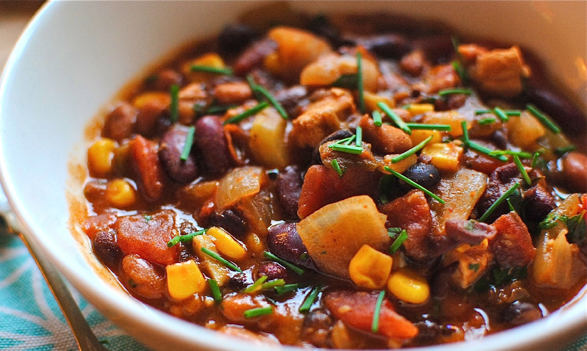 Получается питательное, насыщенное блюдо. Для него можно фасоль не варить, а печь. Сверху посыпать сыром, смешанным со свежей, пряной зеленью. Ингредиенты: морковь - 4 штуки; томатная паста; ветчина - 270 гр; плоды красной фасоли - 250 гр; очищенные орехи (грецкие) - 110 гр; зеленый лук - 90 гр.; специи (сухих пряных трав); клубни розового картофеля - 5 корнеплодов; колбаса (вареная) - 260 гр.; кусочки копченой курицы - 270 гр. Процесс исполнения: Отдельно подержать в холодной воде фасоль. Затем воду убрать. Налить чистой воды. Поставить варить с кусочками картофеля и моркови. Поместить порезанный лук. Вскипятить. Держать на огоне 15 минут. Добавить толченные орехи (например, грецкие). Посыпать квадратиками из колбасы. Поместить томатную пасту, подогретые на раскаленном масле кусочки зеленого и репчатого лука. Затем посыпать перцем. Добавить прямоугольники из порезанного куриного и ветчинного мяса. Расположить приготовленные плоды фасоли в глубокую посуду. Покрыть кусочками зе